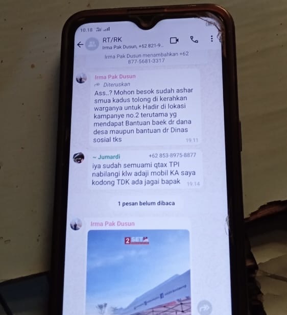 “Ass, mohon besok sudah ashar sema kadus tolong dikerahkan warganya untuk hadir di lokasi kampanye nomor 2 , terutama yang mendapat bantuan baek dari dana desa maupun bantuan dari dinas sosial,” percakapan di grup WhatsApp bernama RT/RK.