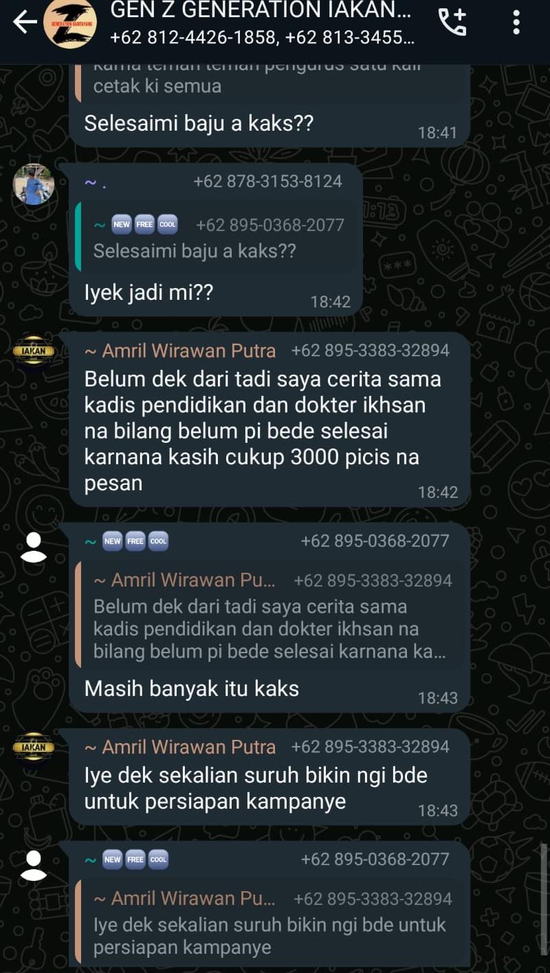 Dalam percakapan grup tersebut, salah satu tim pemenangan Ilham – Kanita, Amril Wirawan Putra menyebutkan jika Kadis Kesehatan dan Kadis Pendidikan berperan sebagai sponsor Bahan Kampanye (BK) berupa baju kaos.